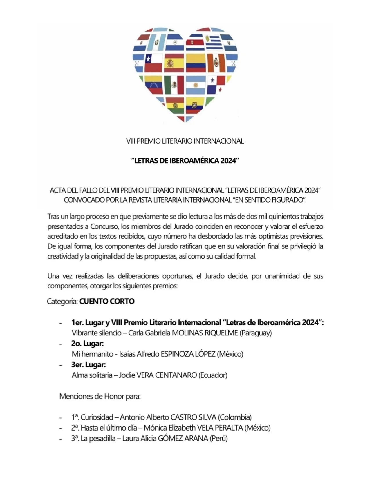 Primer puesto del VII concurso de Letras de Iberoamérica, año 2024